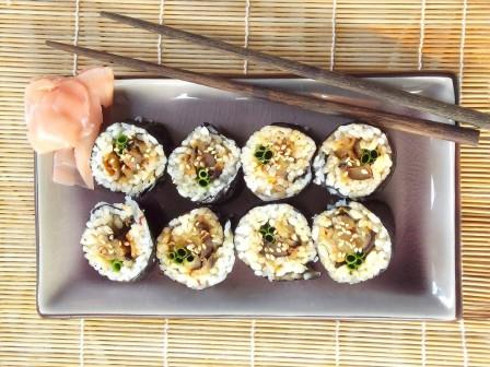 Made with tender eggplant strips that are pan-fried in garlic and chilli paste then rolled up with sushi rice and nori.