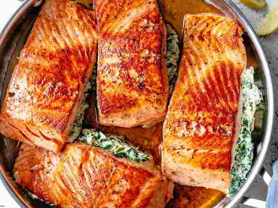Fill salmon 'pockets' with 1-2 tablespoons of the spinach dip, spreading evenly with the back of the spoon.