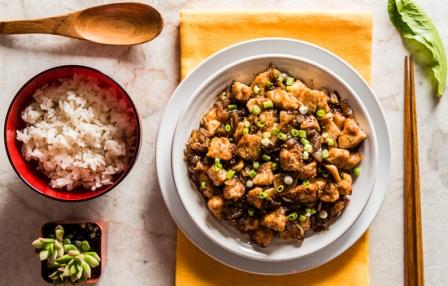 Add the remaining 1 tablespoon oil to the pan and turn to medium heat. Add ginger, garlic and shallots. Cook until shallots begin to turn soft, 30 seconds. Add sauce and give it a quick stir. Add chicken back into the pan. Stir and cook until the sauce thickens, 1 minute. Immediately transfer everything to a plate.