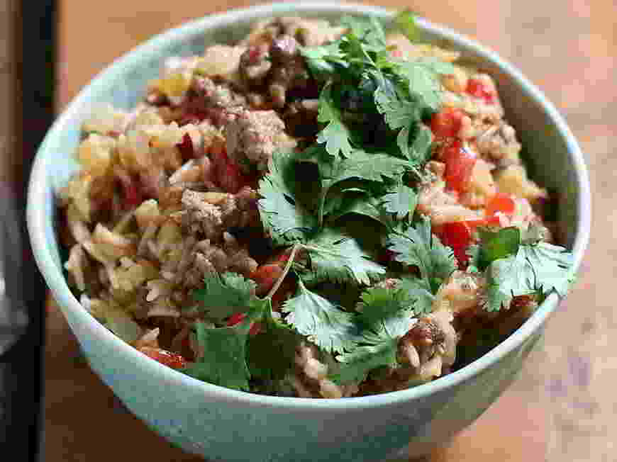 Serve lamb stir fry with the coconut rice and fresh coriander.