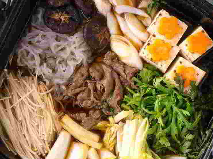 Get together with friends and family with this homemade Japanese sukiyaki. Served with beef, a variety of vegetables and cooked in a soy sauce broth.