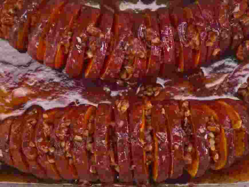 Dress the kumera with your mixture, making sure to get the dressing not just on top of them, but inside the gaps. This will infuse the entire kumera with the sweet delicious flavours, and add the crunchy pecan texture to the softer inside.
