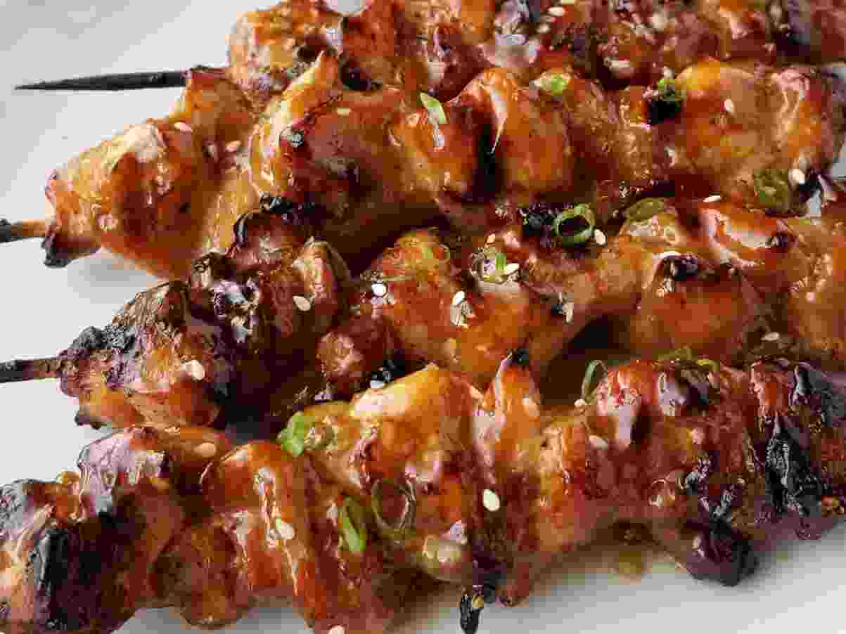 Remove skewers from grill and serve with chopped spring onion and a sprinkle of sesame seeds.