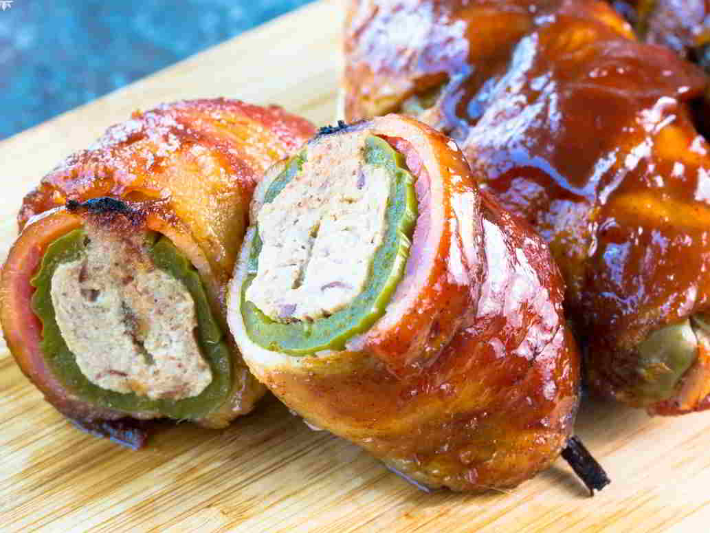 Bacon-wrapped jalapeño poppers with a creamy beef filling and a BBQ glaze. This recipe requires pre-cooked brisket which makes it a great way to use up any leftover brisket.