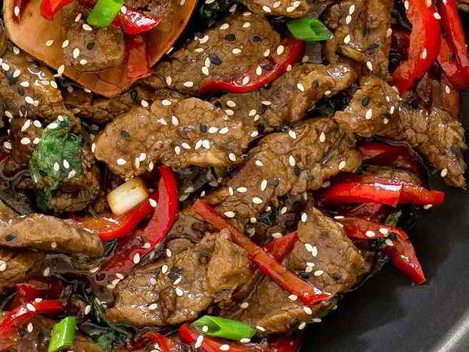 Heat oil in a large frypan over high heat. Remove the beef from the marinade and sear the beef until just browned, 2-3 minutes. Remove from the pan and set aside.