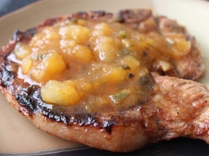 Marinated pork chops are grilled to perfection then topped with a spicy salsa including pineapple, mango and apple sauce.