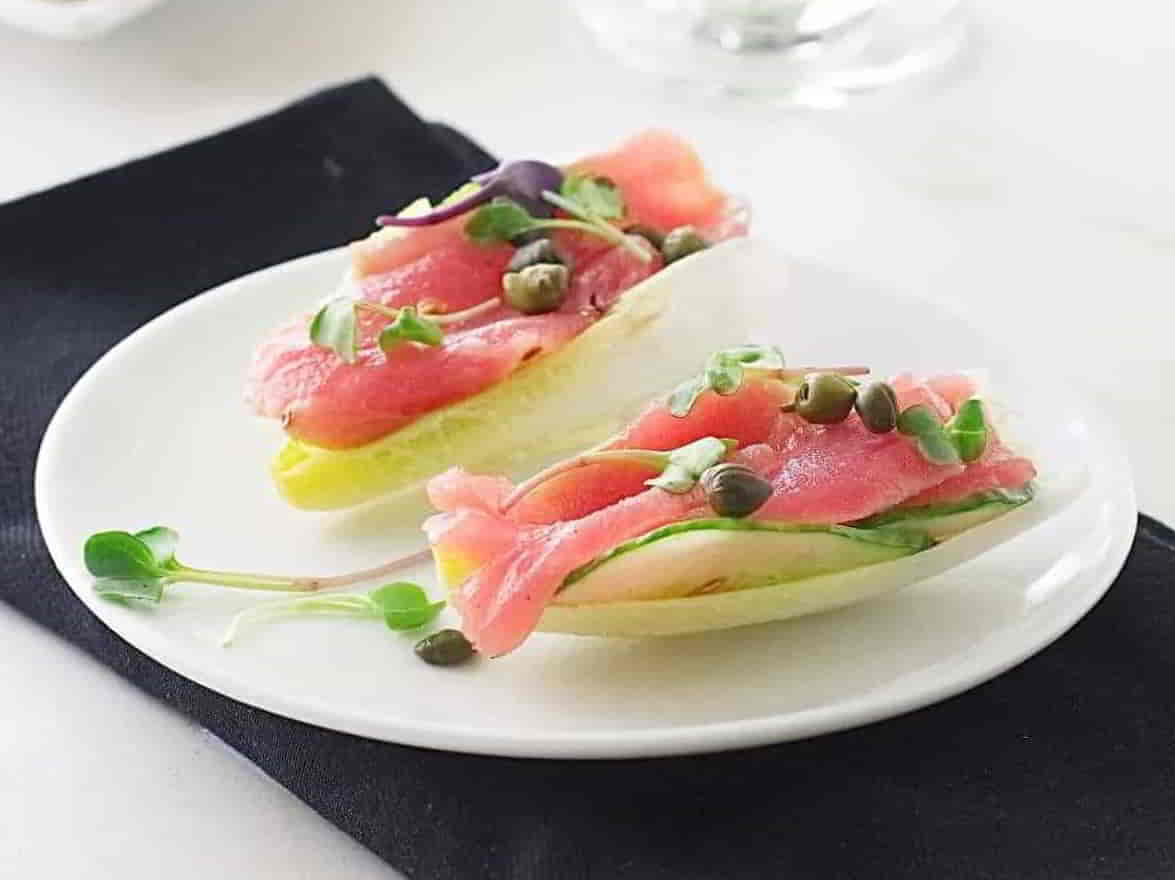 Tuna Crudo appetizers are delicate slices of raw tuna, drizzled with a light lemon vinaigrette and served with cucumber slices in endive boats.
