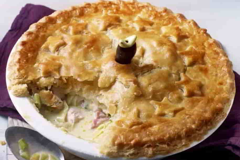 Turkey and ham pie has a delicious flaky crust with a savoury filling of turkey and ham. The sauce in the filling has the nutty flavour of mushrooms and has the earthy delight of leeks and parsley.