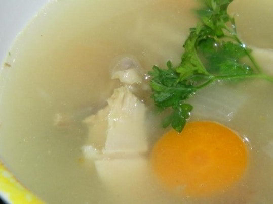 A simple method for making turkey soup. Simmer turkey bones with onion, carrots, celery, and herbs for a tasty stock. Just add chopped leftover turkey meat and the soup is ready.