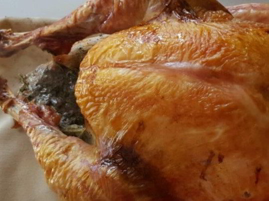 Preheat an oven to 175°C. Line a turkey roaster with long sheets of aluminium foil that will be long enough to wrap over the turkey.