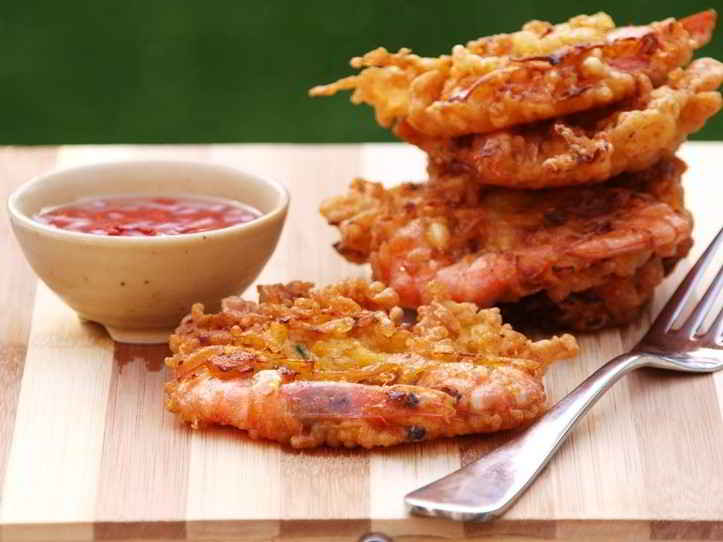 In a pan, add oil enough for deep frying but letting patty settle down flat on the pan. Using a scoop, spoon out shrimp batter and place in pan like mini pancakes, frying each side for about 2 minutes each.