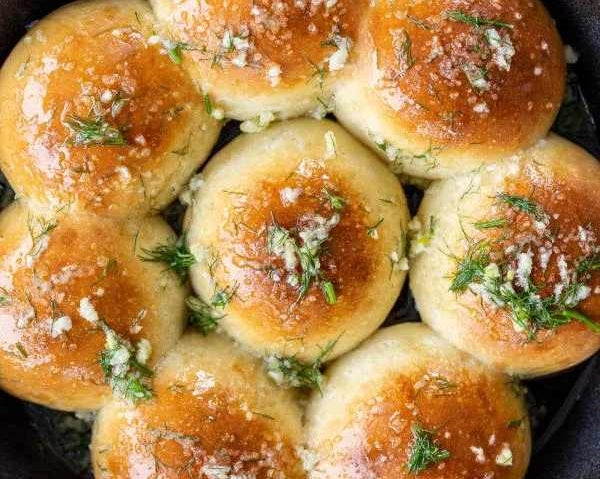 This recipe for Ukraine Pampushky features yeast dough rounds that are baked until golden brown then slathered in garlic oil herbs. Best with borscht.