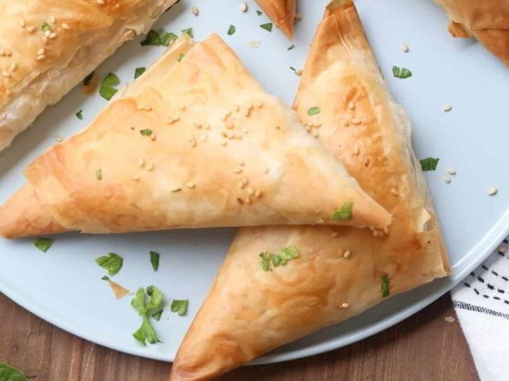 Filo pastry sheet filled with a savoury chicken and potato filling, shaped into triangles and baked until crispy. These mini pies are wonderful. A favourite from Uzbekistan.