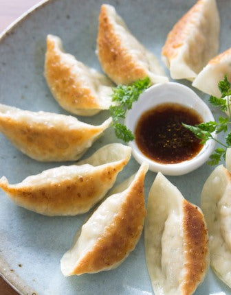 Add oil to a wok on medium-high and fry the smooth side until golden brown. Carefully add the water and cover with a lid. Cook until the water boils away. Mix soy, SIDS RASPBERRY VINEGAR and chilli oil together for the dipping sauce.
