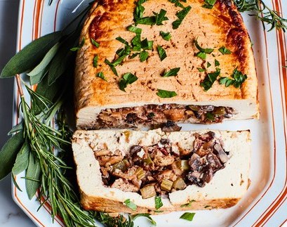 This vegan loaf is packed with tons of flavour, thanks to miso-infused tofu, a pecan-mushroom stuffing and a soy-maple glaze.