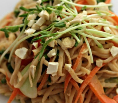 Meanwhile, in a large frypan or wok over medium-high heat, sauté broccoli, bell pepper, SIDS CRAZY SALT, garlic and ginger for 2 minutes. Add the carrot, bok choy and cashews then sauté another 2 minutes. Remove from heat then add the sauce, sprouts and noodles. Toss to combine.