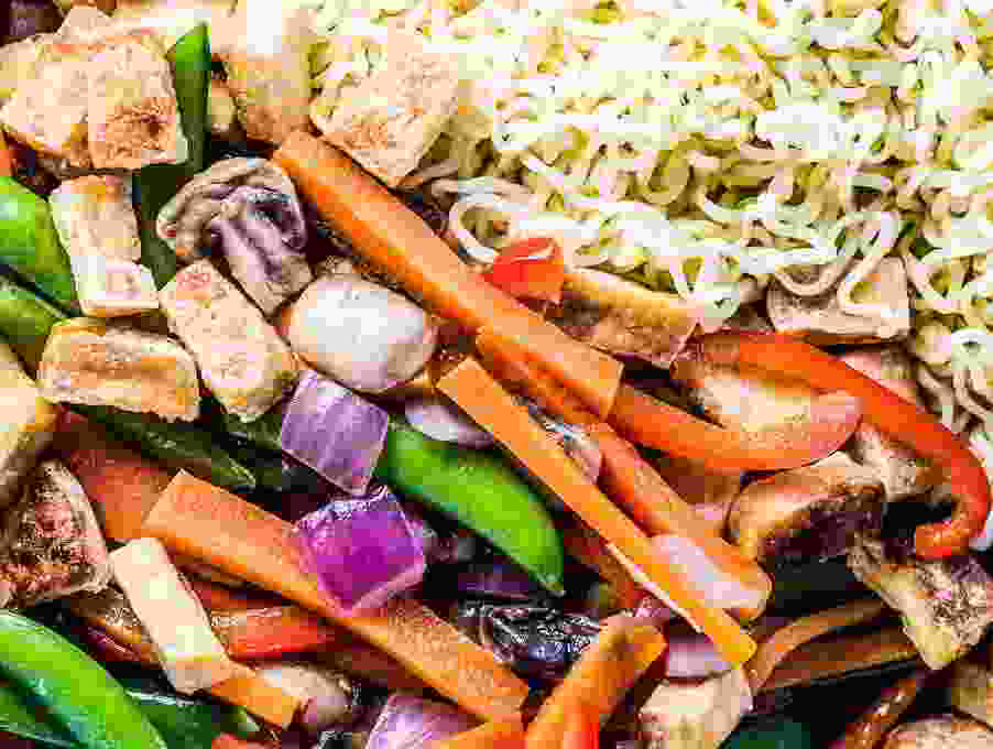 Add vegetable stock and all the sauce ingredients to the pan and bring them to a boil for 5 minutes. Mix the cornflour with a little cold water and add it to the sauce. Let the sauce thicken then add the noodles, vegetables, and tofu to the pan then mix everything together. Top with any or all of the optional toppings and serve right away.