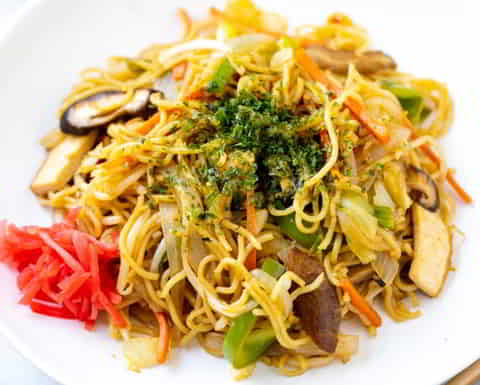 Serve the Vegetable Yakisoba on individual plates and garnish with aonori and pickled red ginger.