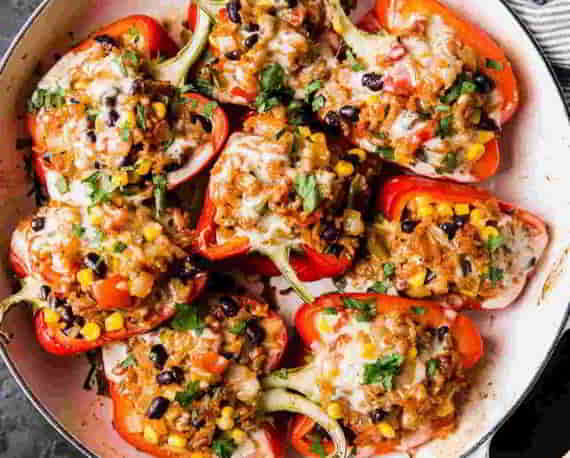 Arrange the peppers in the baking dish and fill them with the rice mixture, dividing evenly. Top with cheese then bake, uncovered, until cheese is bubbling and golden brown, about 40 minutes.