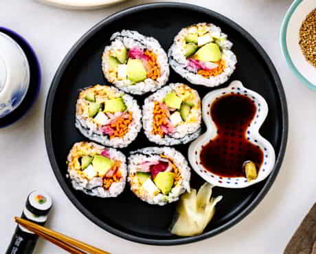 Arrange your Vegetarian Sushi Rolls on a plate and serve with soy sauce, wasabi, and pickled ginger on the side.