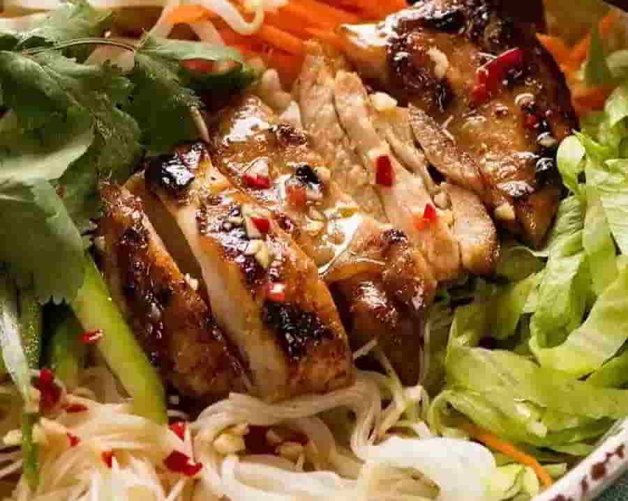 Individual Servings: Place noodles in bowl. Top with vegetables and herbs, and sliced chicken pieces. Drizzle with a few tablespoons of Nuoc Cham Sauce (be generous, ~ 4 tbsp per serving) and serve with lime wedges.