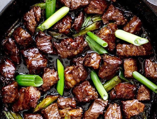 Once the meat has sat for 1 hour, heat a large heavy bottomed frypan over high heat until very hot. Add the remaining oil (a little less than ⅓ cup) and heat until just barely smoking. Carefully add the meat and cook undisturbed, over high heat for 1 minute until browned. Turn the meat and cook for 1 minute longer until browned. Add the bell peppers and sauté 1 minute. Add the spring onions and cook for 30 seconds. Pour in the soy sauce mixture, shaking the frypan to coat the meat. Turn off the heat.