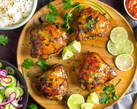 Bake until thighs register 68-71°C on an instant-read thermometer, about 35 minutes. (Be sure to measure temperature in the centre of the thickest part of the thighs, but not directly against the bone) If chicken skin is not brown and crisp enough by the time the thighs are cooked through, turn on oven grill and grill until browned and crisp, about 1 minute, being careful not to burn the skin. Transfer chicken to a platter and let rest for 5 minutes. Garnish with lime slices and coriander, then serve.