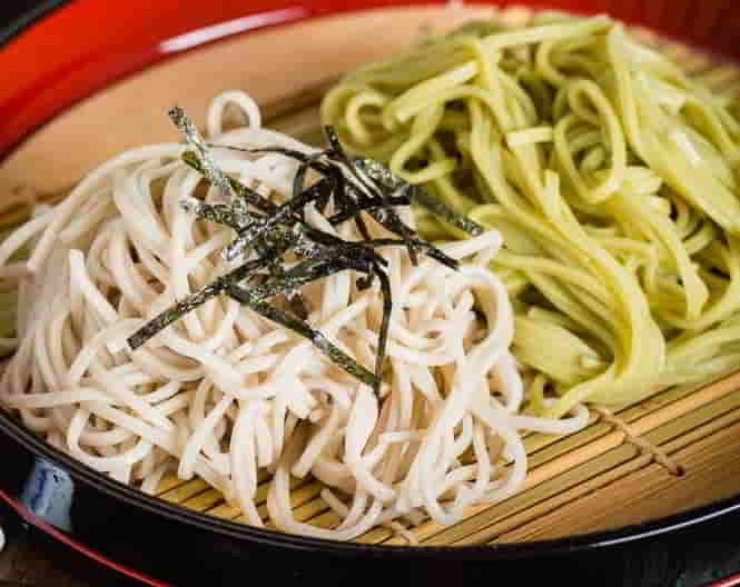 Place bamboo sieves or mats over individual plates. (to catch the draining water from the noodles) Place one serving of soba noodles on each mat and garnish with the shredded nori seaweed on top.